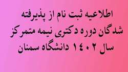 اطلاعیه شماره 2:اطلاعیه ثبت نام از پذیرفته شدگان دوره دکتری Ph.D نیمه متمرکز سال 1402 دانشگاه سمنان