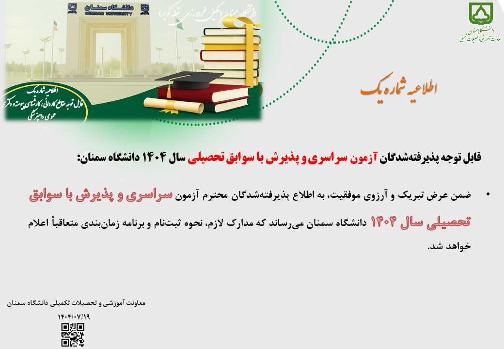 اطلاعیه شماره یک: قابل توجه پذیرفته‌شدگان آزمون سراسری و پذیرش با سوابق تحصیلی سال 1404 دانشگاه سمنان