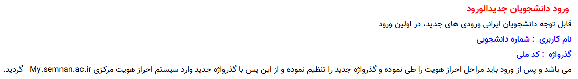 دانشجویانی که بعد از پذیرش نهایی، آیکون "آموزش گلستان" را در سامانه احراز هویت مرکزی (my.semnan.ac.ir) مشاهده نمی‌کنند، باید با شماره دانشجویی و کدملی خود وارد سامانه شوند و در صورت دریافت خطای "نام کاربری و یا رمز عبور اشتباه است "، باید در قسمت نام کاربری: شماره دانشجویی را وارد نموده سپس بر روی گزینه "بازیابی گذر واژه و رمز عبور" کلیک کرده و گذرواژه جدید ساخته شود، در نهایت بعد ثبت شماره کارت و شماره شبا، با کلیک بر روی گزینه پیشخوان (داخل سامانه احراز هویت مرکزی، سمت راست)، کلیه سامانه‌های مربوطه به دانشجو فعال شده و قابل مشاهده می‌باشند.
